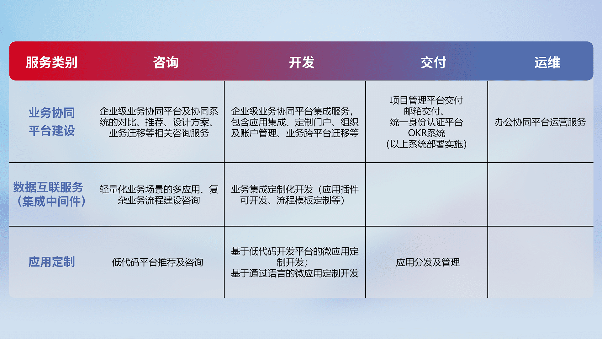 针对钉钉、、、、企微、、IDaas等平台级产品提供产品的规划、、、方案、、、、交付、、、定制化开发等服务,,,,实现如统一协同办公、、、、智能客户服务、、混合会议管理、、、、智能数据查询、、等业务场景,,,实现数字化转型。。